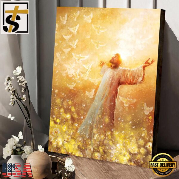 Photos Of Jesus Stands In Field Flowers With Doves Canvas Oh, Lord Poster , Christian Wall Art
